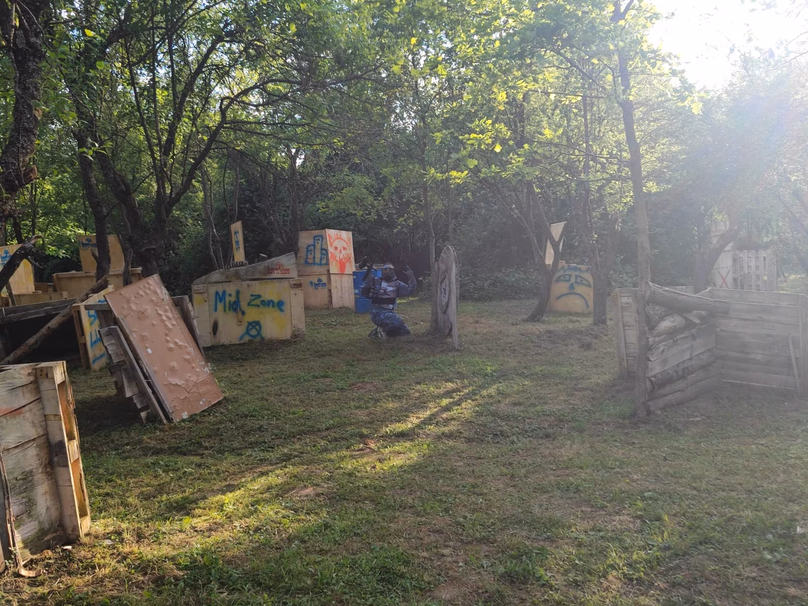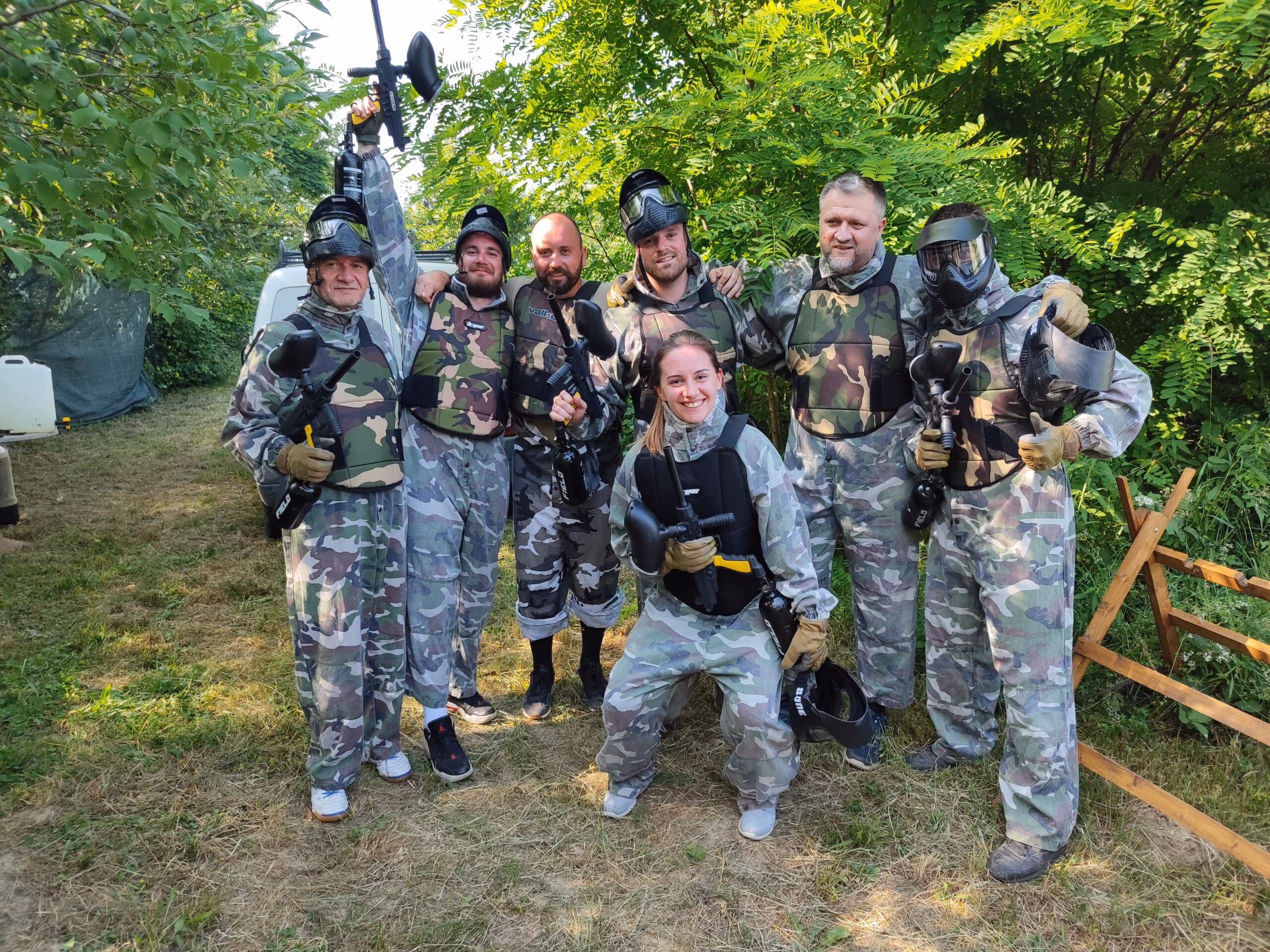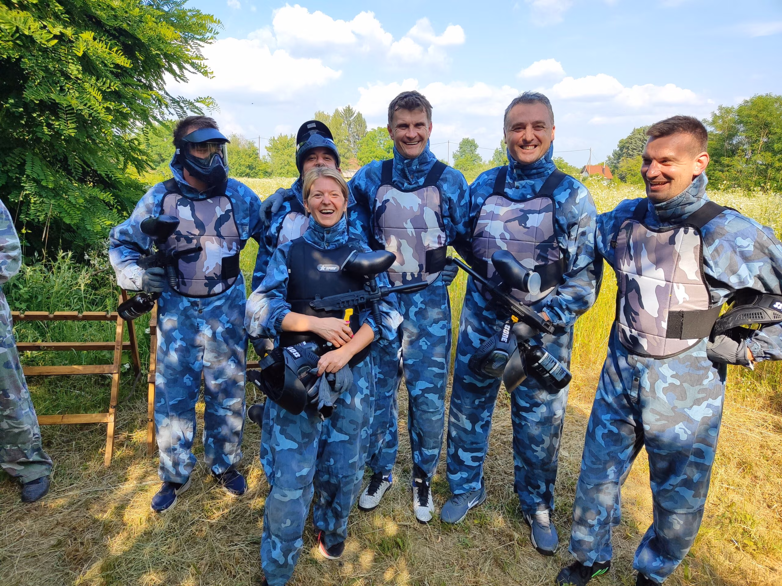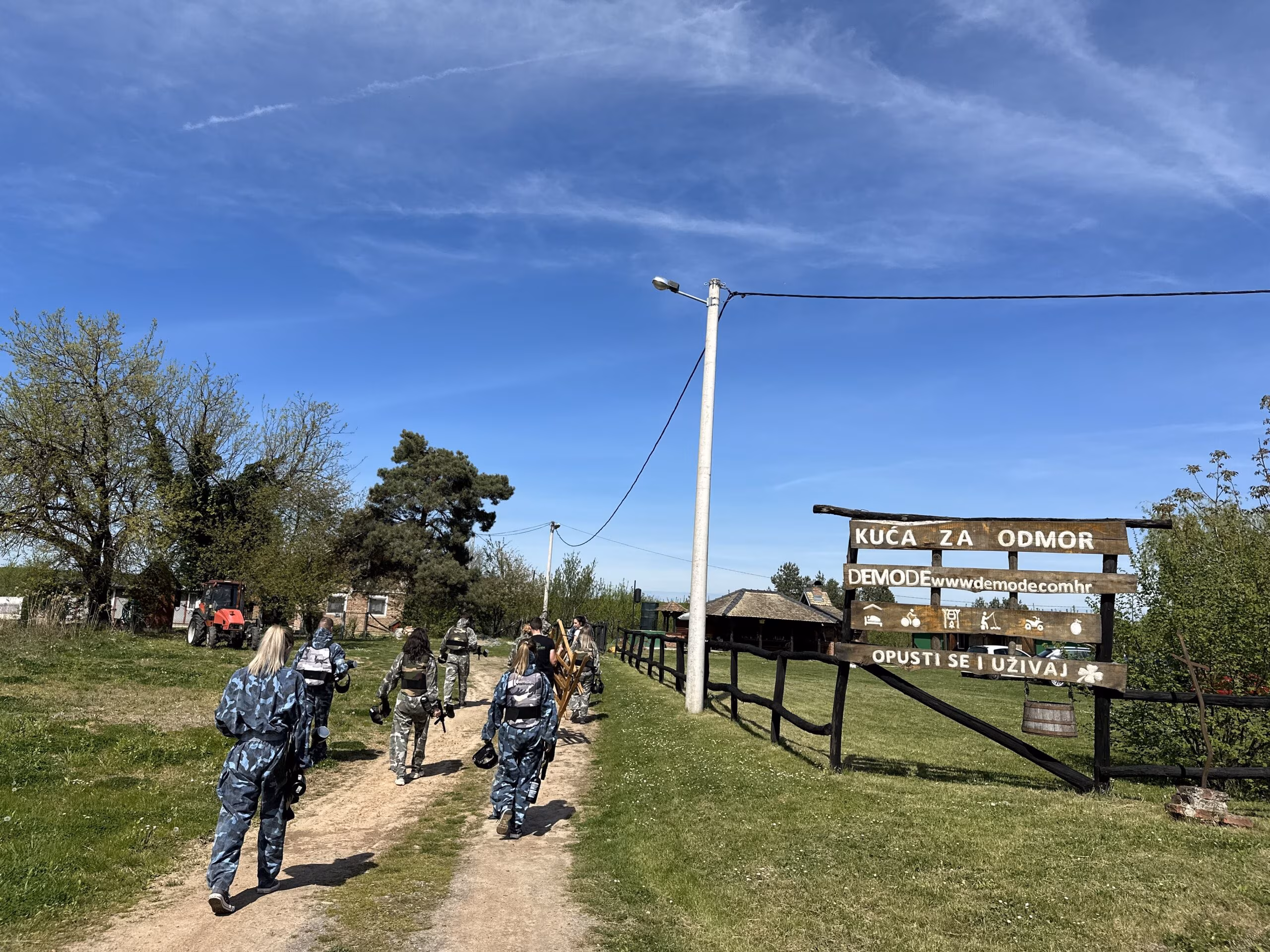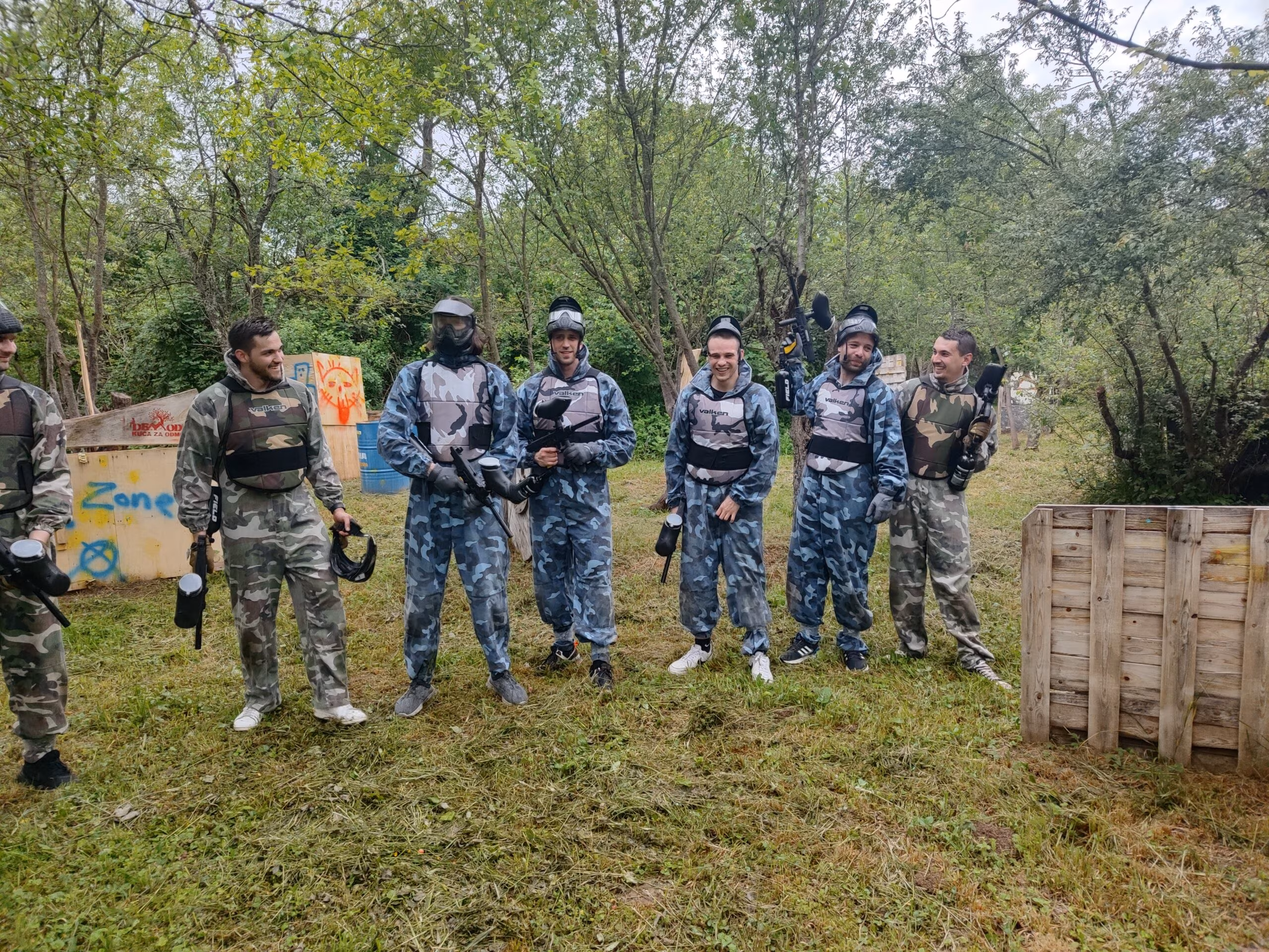 Paintball je adrenalinska timska igra koja se igra u prirodi na poligonu, smještenom direktno uz kuću za odmor Demode u selu Paučje. Teren je postavljen u starom šljiviku okruženom šumom — idealno za grupe koje žele nešto više od klasičnog izleta. Potrebno je minimalno 8 igrača, a najpopularnija kombinacija je 10 igrača podijeljenih u dva tima. Svaki igrač dobiva kompletnu zaštitnu opremu i 50 kuglica po rundi. Cijena iznosi 55 € po osobi i uključuje svu opremu, sudca i animatora. Termin traje između 3 i 4 sata ovisno o tempu igre — od prvog brifinga do zadnje runde i prepričavanja ratnih priča uz sjenicu. Cijene paintballa možete pogledati ovdje.
